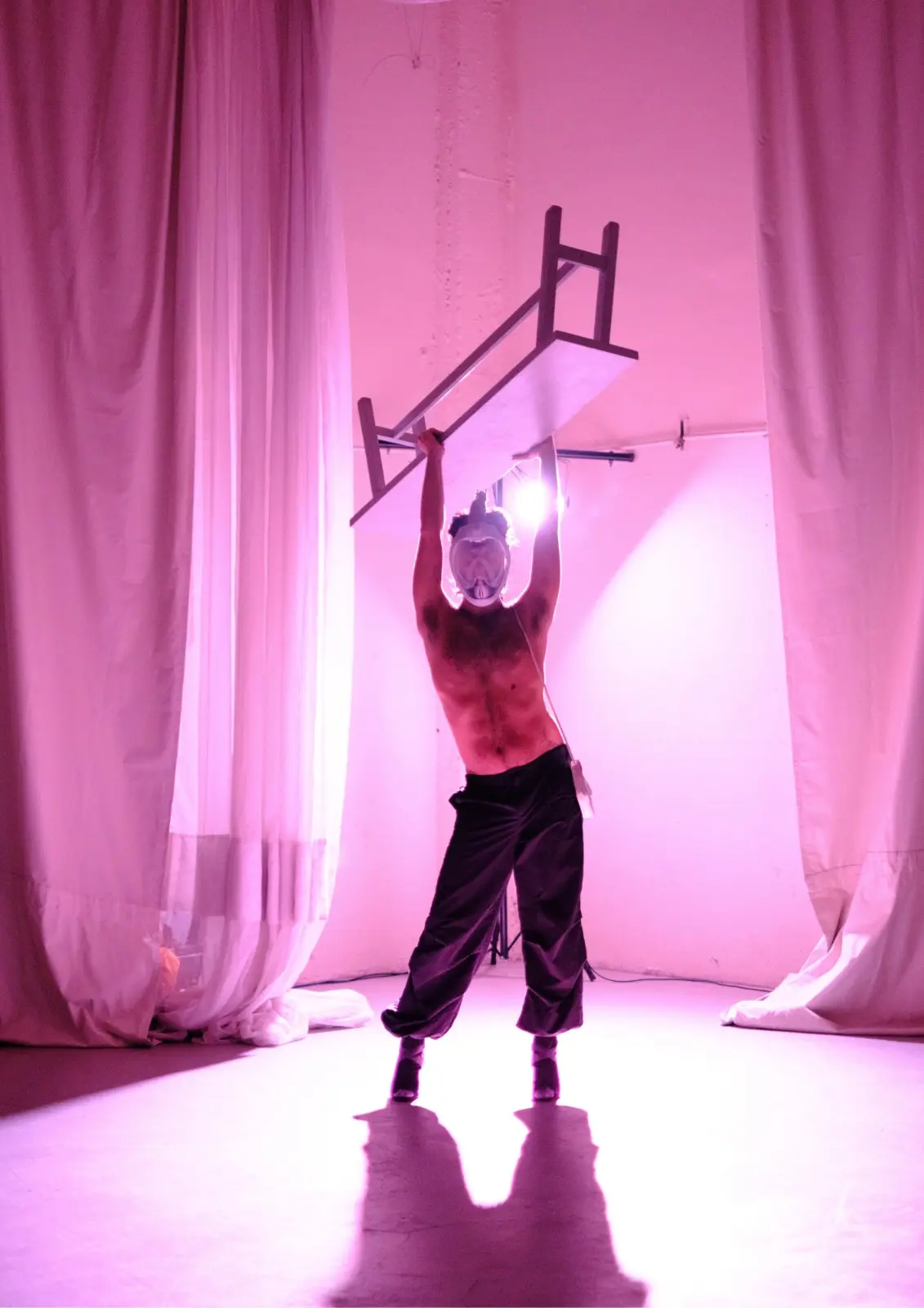 Mit Stimme, Soundeffekten und Bewegung erkundet Martín M. Wollmann in their Performance Momente des Schwimmens, der Resonanz und des Echos. Martín M. Wollmann ist Tänzer*in, Osteopath*in, Astrolog*in und Künstler*in. Mittels verschiedener somatischer und künstlerischer Praktiken sucht they nach Verbindungen dieser Tätigkeiten, um so neue Zugänge zu Körperlichkeit und Intimität zu finden.
